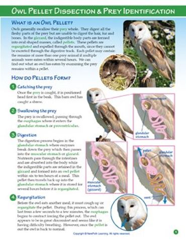 Owl Pellet Dissection & Prey Identification Visual Learning Guide provides comprehensive coverage of owl pellets and how they form. Each 11" x 17" laminated Write-On/Wipe-Off guide includes four panels of helpful information to engage students in the study of owl pellets.