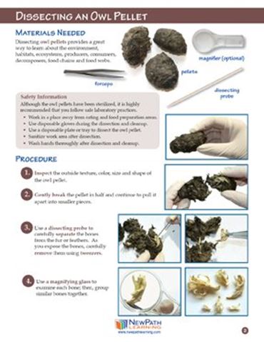 Owl Pellet Dissection & Prey Identification NewPath Visual Learning Guide provides comprehensive coverage of owl pellets and how they form. Each 11" x 17" guide includes four panels of helpful information, including an overview, practice exercises, a graphic organizer and assessment and review questions. Each laminated Write-On/Wipe-Off guide provides an engaging way to study owl pellets. Set of 10.