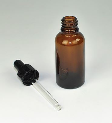 Amber glass dropping bottles have a heavy duty plastic cap with a rubber bulb. The dropper pipet reaches very close to the bottom of the bottle.